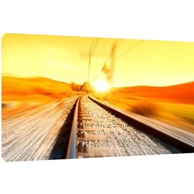 Train rail background at sunrise Quality Canvas print, hand stretched around a wooden frame, manufactured in the UK by MOOL Printed on High Quality Waterproof Canvas and coated with protective varnish to inhibit Ultra Violet fade and yellowing of your canvas Comes complete with taped backing and hanger to make mounting your canvas quick and easy Size 32” x 22” x 0.71” (81cm x 56cm x 2cm)