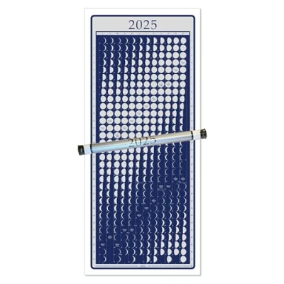 Moon Calendar 2025 poster/chart Moon Calendar Poster Size: 16" x 36.5". Made in USA. Silver moons on dark blue background. Accurately keyed to date and day of the week. Full and New Moons shown in Universal Time (usable around the world) Includes MoonWatcher guide for eclipses, blue moons, supermoons, apogee, perigee, etc.