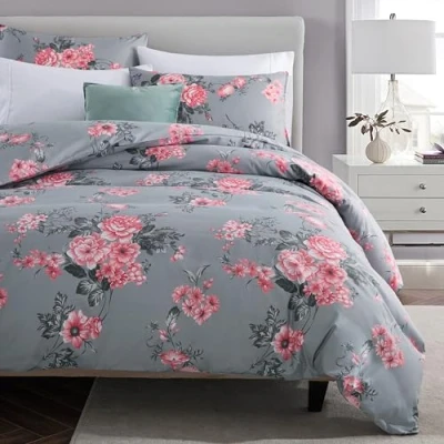 MOONLIGHT20015 Double Bedding Duvet set (200 x 200 cm) with 2 Pillowcases Reversible Printed Soft Hypoallergenic Microfiber Cover (Grey Bouquet, Double)