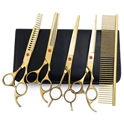 ALL IN ONE PET GROOMING KIT: The dog grooming kit includes - 7" thinning shear + 7" curved scissor + 7" chunking scissor + 7" straight cutting scissor + 1 pet comb + 1 cleaning cloth + 1 stylish black leather case. The curved scissor is great for trimming around head, ear, eyes, fluffy legs and paws. The chunking shear is to thin the thick fury animals. The straight scissor is to cut long hair and fur on body, these grooming scissors will cover your basic everyday grooming needs HIGH QUALITY PET GROOMING SCISSORS: This dogs grooming scissors kit made in high-end Japanese 440C carbon stainless steel. Titanium Coated and cold treatment for hardness, durability, each blade comes with razor sharp edges, providing the groomer smooth and quiet cutting experience. Suitable grooming for a variety of animal, you won't ever need another dog grooming scissors again! SILENT DOGS GROOMING SCISSORS - These dog grooming scissors has a silencer between the handles which means quiet grooming for your sensitive cat or dog, less scary to your pets. The pet grooming scissors are Quiet Alternative to Electric Clippers for Sensitive Pets. Perfect for the professional pet groomer or at-home DIY groomer. ERGONOMIC GROOMING SCISSORS -The handles of the dog grooming scissors are engineered to be extremely comfortable and help to minimize the strain and discomfort and even include a molded finger rest, truly ergonomically designed for the chunking, thinning and cutting of your animals hair. A useful jewelled adjustable tension screw makes it easy to adjust the scissors to match the needs and ensure a smooth scissoring action time after time International products have separate terms, are sold from abroad and may differ from local products, including fit, age ratings, and language of product, labeling or instructions.
