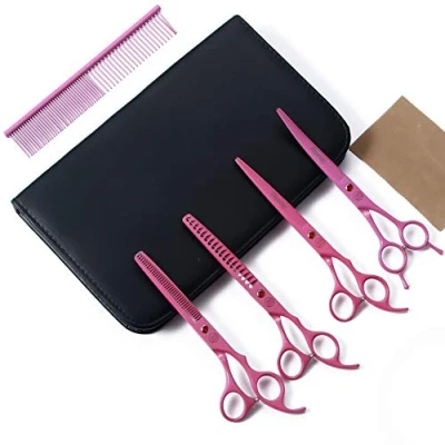 ALL IN ONE PET GROOMING KIT: The dog grooming kit includes - 7" thinning shear + 7" curved scissor + 7" chunking scissor + 7" straight cutting scissor + 1 pet comb + 1 cleaning cloth + 1 stylish black leather case. The curved scissor is great for trimming around head, ear, eyes, fluffy legs and paws. The chunking shear is to thin the thick fury animals. The straight scissor is to cut long hair and fur on body, these grooming scissors will cover your basic everyday grooming needs HIGH QUALITY PET GROOMING SCISSORS: This dogs grooming scissors kit made in high-end Japanese 440C carbon stainless steel. Titanium Coated and cold treatment for hardness, durability, each blade comes with razor sharp edges, providing the groomer smooth and quiet cutting experience. Suitable grooming for a variety of animal, you won't ever need another dog grooming scissors again! SILENT DOGS GROOMING SCISSORS - These dog grooming scissors has a silencer between the handles which means quiet grooming for your sensitive cat or dog, less scary to your pets. The pet grooming scissors are Quiet Alternative to Electric Clippers for Sensitive Pets. Perfect for the professional pet groomer or at-home DIY groomer. ERGONOMIC GROOMING SCISSORS -The handles of the dog grooming scissors are engineered to be extremely comfortable and help to minimize the strain and discomfort and even include a molded finger rest, truly ergonomically designed for the chunking, thinning and cutting of your animals hair. A useful jewelled adjustable tension screw makes it easy to adjust the scissors to match the needs and ensure a smooth scissoring action time after time International products have separate terms, are sold from abroad and may differ from local products, including fit, age ratings, and language of product, labeling or instructions.