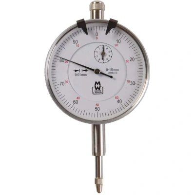 General description This precision dial indicator features a satin-chromed body and tungsten carbide measuring contact, designed for measuring small distances with high accuracy. It includes a double dial for measurements in millimeters and is built with a shockproof design to withstand accidental knocks. A micrometer ball attachment is available for measuring round or irregular surfaces, ensuring reliable contact with the object being measured. Technical specifications Range: 0-10mm Resolution: 0.01mm Dial Diameter: 58mm Stem Diameter: 8mm Type: Ear Back Compatibility and accessories Suitable for use with standard external micrometers Includes a ball attachment for measuring round or irregular surfaces Ball attachment is compatible with Moore & Wright 878 series micrometers Installation Attach the dial indicator to a compatible stand or fixture as needed Fit the ball attachment onto the anvil or spindle of your external micrometer Ensure the ball is securely fitted before measurement