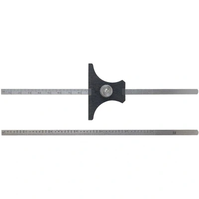 General description This reversible base depth gauge is designed for precise measurement of depths in confined spaces. It features accurately ground top and bottom faces, allowing the base to be reversed easily. The gauge includes a full range of adjustable rules that can be fixed in place with a locknut, ensuring accurate readings. The scale is graduated on both sides for versatile use. Technical specifications Size of base: 18/56mm (0.71/2.21 inches) Width: 5.5mm (0.22 inches) Thickness: 1.0mm (0.04 inches) Blade length: 195mm (7.68 inches) Graduations: Front face in 1/32nd inches, rear face in 1.0mm Compatibility and accessories Suitable for use with standard depth measurement applications in various industries Compatible with other measuring tools that accept similar scales Installation No special installation required; simply adjust the rule to the desired measurement and lock in place with the locknut. Usage Use the gauge to measure depths in tight or confined spaces Adjust the