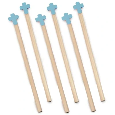 Black wooden pencil with a cross on one end in blue. Made of wood. Natural product Measures 18 x 2 cm. Hexagonal shape for improved ergonomics when using it. Easily erasable. Ideal as a gift for religious celebrations.