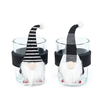This pack includes 2 glass candle holders with Christmas gnome napkin holders. Christmas style and friendly. Christmas decoration for tables. Made of glass and felt. High quality Measures 9x5 cm. Candle not included.