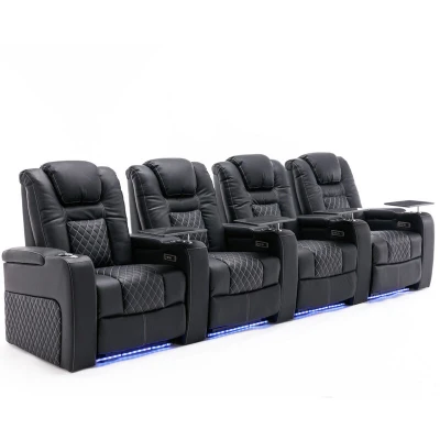 More4Homes BROADWAY HOME THEATER RECLINER SOFA AIR LEATHER, POWER HEADREST, RECLINER, AMBIENT LIGHTING, CUP HOLDERS CINEMA ARMCHAIR CHAIR (Black/White with Tray, 4 Seater)