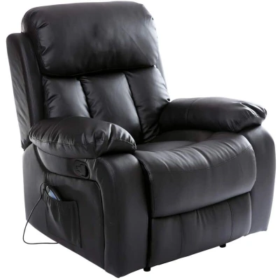 General description This Chester Black Real Leather Recliner Armchair is a heated massage chair designed for ultimate comfort and relaxation. It features a manual recline and built-in footrest, making it ideal for gaming, watching TV, or providing support for those who need extra back assistance. The soft foam padding in the backrest and headrest ensures a perfect balance between comfort and support, while the padded armrests allow for complete relaxation of your arms. Technical specifications Height: 106 cm Width: 96 cm Depth: 88 cm Seat Height: 51 cm Seat Width: 50 cm Seat Depth: 55 cm Backrest Height: 67 cm Backrest Width: 66 cm Recline Dimensions: H: 87 x W: 96 x D: 159 cm Usage Heated backrest warms the muscles in the lumbar region. Massage function targets upper and lower back, thighs, and calves. Eight inbuilt pads provide vibration massage for muscle relief. Controller can be stored in the side pocket for convenience. Other information Available in three colors: black, brown,