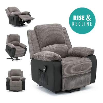 General description The stunning Postana Rise Recliner Armchair has been developed to the highest standards, providing strength, durability, and supreme comfort. Upholstered with super soft Jumbo Cord and contrasting faux leather sides, this chair is designed for ease of use with a single motor mechanism. The simple two-button handset allows you to rise or recline the chair effortlessly, making it ideal for those who require assistance when transferring to or from the chair. Technical specifications Height: 101 cm Width: 96 cm Depth: 96 cm Seat Height: 48 cm Seat Width: 57 cm Seat Depth: 55 cm Backrest Height: 66 cm Backrest Width: 55 cm Recline Dimensions: H:80 x W:97 x D:168 cm Installation The chair is supplied in two separate sections, the base and the backrest, allowing for easy removal from the box and transport within the home. Once situated, the backrest simply clips into the rear section of the base for instant relaxation and comfort. Usage The rise function enables the chair