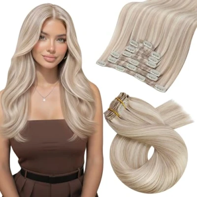 Moresoo Highlights Clip in Hair Extensions Real Human 20 Inch Ash Blonde with Bleached Remy Straight 7 Pieces/120g #P18/613