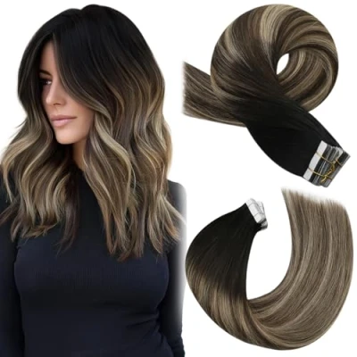 Moresoo Tape in Extensions Human Hair Balayage Real Natural Black Ombre Dark Blonde with Strawberry Remy 14 Inch 20 Pieces/50g #1B/3/27