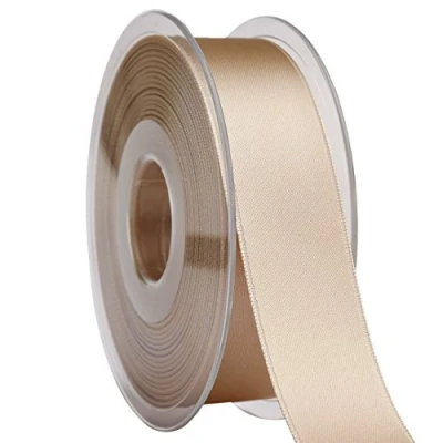 A luxury double-faced ribbon with a soft and silky satin finish 100Percent polyester 1" x 27 yd in Beige Completely washable and dry cleanable very high quality Used for special occasions, especially weddings and bridal showers