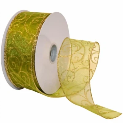 Morex Ribbon 7416.60/50 621 Swirl 2.5" X 50 YD Nylon Sheer Curling Wired Glitter Ribbon, Moss/Gold, Holiday Ribbons for Crafts and Christmas Decorations, Indoor Gift Wrapping