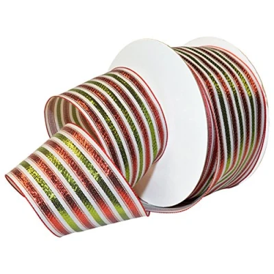 This New and trendy holiday ribbon is a great addition to any craft collection! modern touch to vintage pin stripes 100percent polyester 2 1/2 inches by 50 yards in color White/Green/Red Baroque Noel ribbon is great for decorating, gift wrapping and crafting! the sparkle stripes work wonders on trees, wreaths and Floral arrangements Wired edge Morex item Number 7487.60/50-699