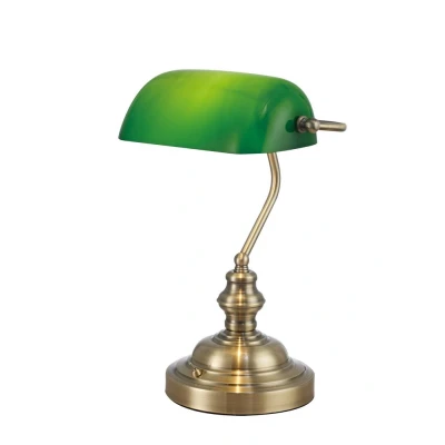 Morgan Bankers Table Lamp 1 Light E27 Antique Brass, Green Glass