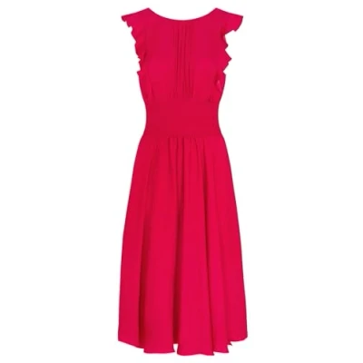 Long flared dress with smocked waist; flared fit; Long dress; Round neck; Sleeveless; back zip fastening; Smocked waist; V-neckline at back; frill panels on the sides of the bust; The model is 1.75 m tall and wears a UK size 8