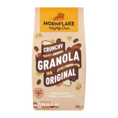 GRANOLA: Original granola was invented in New York as a mixture of crumbled graham flour. Nowadays it is typically made with rolled oats and a variety of added ingredients including fruit, nuts, chocolate, syrup and more, for a delicious healthy breakfast! Very similar to muesli cereal. CRUNCHY ORIGINAL: The finest oats are milled and toasted in our unique way – we then combine them with juicy raisins, golden honey and almond pieces to create the tastiest, crunchiest granola clusters. Enjoy cold, hot, with dairy milk, almond, soya, oat milk, as a crunchy yoghurt topping or simply as a snack, whatever is your preference! BENEFITS: High in fibre, No added salt, contains wholegrain & helps to actively lower cholesterol when consumed as part of a varied balanced diet and a healthy lifestyle. Oat beta glucans have been shown to help lower blood cholesterol SUSTAINABLE: At Mornflake we are committed to help protect the world's rainforests from deforestation. We make sure that all ingredients used for our products are sourced responsibly ABOUT US: Our family has been milling oats in South Cheshire since 1675, making us Britain’s fourth-oldest family-owned company. Today, 15 generations later, we are still independent and just as passionate about providing you with a great-tasting, great-value breakfast using the finest-quality oats