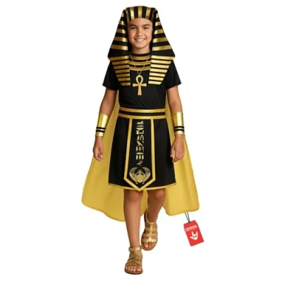 Our egyptian costume for kids is a complete 6-Piece Set: Includes a black tunic, royal headpiece, collar with attached gold cape, detailed belt, ankh necklace, and arm cuffs. Pharaoh costume for boys is available in 3 sizes: Small (4-6 Years), Medium(7-9 Years) and Large (10-12 Years). Please see our size chart to find your childs' perfect fit Royal Details: Features high-quality gold foil prints, authentic hieroglyphics, and a scarab beetle design on the belt for a majestic look. Easy to Wear & Adjust: Features simple velcro-style fastenings, fabric with stretch, plus an elasticated waist for a secure, hassle-free fit Built for History Adventures: Our costume with stands active play, ideal for school curriculum projects, World Book Day, Halloween Costumes For Kids and more! This costume provides all-day comfort: it’s made from lightweight, stretchy, breathable materials making it easy to put on, move around in and take off, allowing for easy bathroom breaks. Perfect for active play, trick-or-treating, and wearing indoors or outdoors in any weather. Hand wash only., Manufacturer: Morph