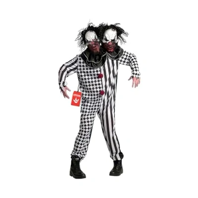 Complete creepy clown costume set – Includes a full-body jumpsuit made from distressed fabric with bold harlequin and stripe patterns, ruffled collar, red 3D pom poms, and a terrifying two-headed clown mask with self-stuffed second head. A ready-to-wear scare from head to toe. Available in men's sizes L–XL – Designed for adult men and available in Large, and X-Large. For the perfect freak-show fit, check the product images for our detailed size chart. Double the heads, double the horror – This scary clown costume adult design features two gruesome faces for spine-chilling impact. Ideal for haunted house events, Halloween parties, or turning heads at Carnival and themed festivals. Stand out in twisted circus style – The graphic black-and-white pattern, jagged textures, and oversized features give major horror energy. Whether you're channeling a killer clown or deranged jester, you'll be unforgettable. Perfect for group or solo scares – Pair it with other creepy clown halloween costume adults for a full troupe of terror or steal the show solo as a killer clown. Ideal for halloween costumes men killer clown themes, horror conventions, or twisted fancy dress. This costume provides all-day comfort – It’s made from lightweight, stretchy, breathable materials making it easy to put on, move around in and take off. Reinforced stitching ensures durability for multiple indoor and outdoor wears. Hand wash only., Manufacturer: MorphCostumes