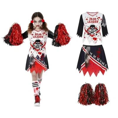 Complete Zombie Cheerleader Costume: This spooky kids' costume includes a blood-splattered cheerleader top and skirt, along with red and black metallic pom-poms to complete the undead cheer squad look. Available In 4 Sizes: Choose from S (4–6 years), M (7–9 years), L (10–12 years), and XL (12–14 years). Please refer to the size guide image to ensure the best fit for your little ghoul. Perfect For Halloween Fun: Whether she’s on team trick or treat, this girls’ zombie “fearleader” costume is packed with eerie details and a unique print that’s perfect for Halloween parties, parades, or dress-up days at school. Comfortable And Durable Design: Made with soft, stretchy, and breathable materials for all-day wear. The flexible fit allows for easy movement—great for dancing, running, and playing. From A Trusted Costume Brand: MorphCostumes was founded in 2009 by three friends who love dressing up. With hundreds of high-quality designs and a global presence, we're committed to costumes that deliver style, comfort, and fun. Made To Last Through Spooky Adventures: Reinforced stitching ensures durability for multiple wears. The costume is easy to put on and take off, making bathroom breaks and quick changes a breeze. Hand wash only for best care., Manufacturer: Morph