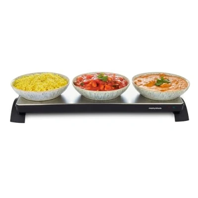 Currys- This Morphy Richards warming tray heats up quickly and keeps your party food hot for up to an hour - It's detachable power cord lets you plug-in or go cord-free whenever you need - Red light shows heating and green confirms the tray's hot - using it is simple - Non-slip feet keeps the tray steady so it won't wobble or slide around - The stainless steel top plate makes cleaning up nice and easy