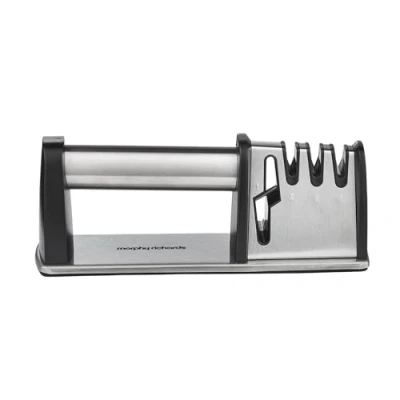 4 Stage Kitchen Safe Knife Sharpener- All-in-One Kitchen Essential: This compact manual knife sharpener combines 4 essential functions: scissor sharpening, blade preparation, sharpening, and polishing. Ideal for restoring dull knives and scissors, it keeps your kitchen tools razor-sharp and ready for action. Easy to Use – Safe & Effective Sharpening: Simply insert the blade at a 90° angle and pull from heel to tip with light pressure. Whether you're a beginner or a pro, this kitchen knife sharpener delivers consistent results in seconds—no electricity or special skills needed. Ergonomic Handle – Comfortable for Left & Right-Handed Users: Designed with an easy-grip ergonomic handle, this sharpener offers a secure, comfortable hold for both left- and right-handed users. Its lightweight, portable design makes it perfect for any kitchen setup. Non-Slip Base – Sharpen with Confidence: The non-slip base ensures ultimate stability and safety while sharpening. No more slipping or sliding—just smooth, controlled strokes that protect your hands and surfaces. Trusted Morphy Richards Quality – Found in 3 of 5 UK Homes: A global brand with British roots, Morphy Richards delivers reliability and innovation. This high-quality knife and scissor sharpener is built to last, making everyday kitchen prep faster, safer, and more efficient.