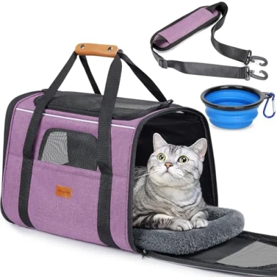 GREAT DESIGN: This portable pet carrier is made of durable, high-grade polyester. It features breathable mesh on all three sides to ensure normal air circulation inside the box. There’s also a small pocket on the outside of the bag for storing small items. Plus, a support board helps keep the carrier in good shape. PRACTICAL AND PORTABLE: Measuring 42.9 x 30 x 33cm (16.9’‘1.8’‘x 13’'), this carrier is recommended for pets up to 7kg/15 lbs (please measure your pet’s size and weight before purchasing). It comes with a folding blue bowl and a soft cushion for added convenience. Lightweight and easy to carry, this bag lets you take your pet anywhere for a wonderful and happy trip. EASY TO CLEAN: The dark color of this pet carrier makes it less prone to showing dirt and stains. You can easily clean the surface with a soft brush. The soft cushion inside the bag is removable and can be washed by hand or machine, making it easy to keep everything clean and fresh. VERSATILE: Use it as a tote bag or shoulder bag with the adjustable strap. The carrying handles feature a padded grip for comfortable handling. Perfect for transportation by car, train, plane, and more. In addition to carrying pets, you can also use it to transport other items such as clothes and shoes. BREATHABLE AND SAFE: Morpilot’s breathable and ventilated design allows pets to breathe easily and observe their surroundings. This helps reduce anxiety and creates a more comfortable travel experience for your furry friend. No matter when or where you use it, this carrier keeps your pet safe and secure.