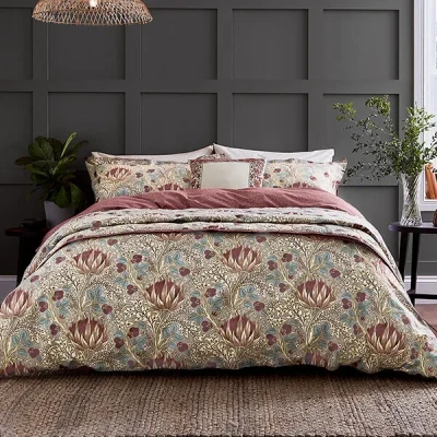 The Morris & Co Artichoke King Size Cover Set in Dove Grey & Wine features large artichoke motifs on a busy background.Made from 100% cotton and machine washable for convenience and a 200 thread count.This set comes with a duvet cover and two matching oxford pillowcases. Pillowcase dimensions: 74 x 48 +5cm.King size: 230cm x 220cm.