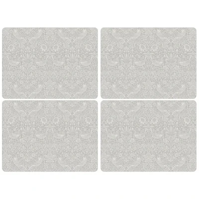 Keep your tabletop in pristine condition with this Morris & Co Set of Four Pure Strawberry Thief Large Placemats.Featuring the iconic Morris and Co. Strawberry Thief design in a beautiful grey and white colourway, these placemats allow you to keep your surfaces free from stains in in style.Perfect for use whilst entertaining friends and family.Dimensions: 30.5cm x 29.8cm.Stain and heat resistant to 100°C.Cork base and crafted from 5mm board sealed with a high quality coating.Wipe clean with a damp cloth.