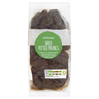 Morrisons Dried Pitted Prunes 500g are partially rehydrated prunes with added potassium sorbate preservative, ideal for adding juiciness to cakes and puddings. Suitable for vegetarians, a 30g serving counts as 1 of your 5 a day; store in a cool, dry place and refrigerate after opening.