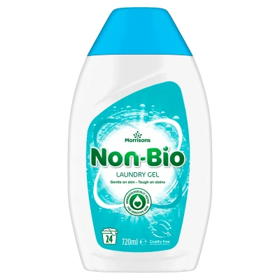 Morrisons Non-Bio Laundry Gel is a concentrated, dermatologically tested formula that effectively removes stains while being gentle on sensitive skin, including babies and allergy-prone users. It offers a fresh, long-lasting fragrance and is cruelty-free, with 24 washes in a 720ml bottle.