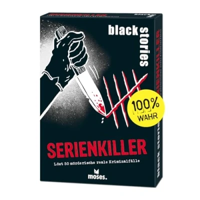 moses 90190 Black Stories Serial Killer 50 Puzzles about Murderous Real Crime Cases, Card Game with Variant and Score Chips, Puzzle for Teenagers Adults, White