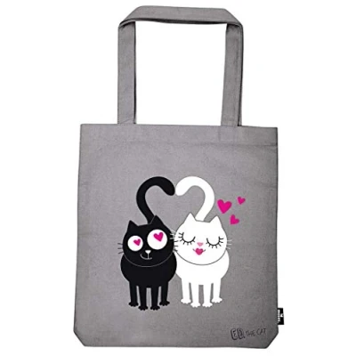 Practical shopper in grey in trendy cat design with romantic cat couple motif for all cat lovers and Ed, the Cat fans. Trendy everyday companion: can be worn comfortably over the shoulder thanks to the long handle. HIGH QUALITY PRINTED - On the front is Ed in Love with girlfriend Kitty, on the back are cute black cat heads and a little pink heart. Versatile accessory: sustainable and reusable fabric bag, made of 100% cotton with stand base for extra space and shopping, for office, university or shopping. Optimal care: hand wash recommended, dimensions 39 cm x 42 cm.