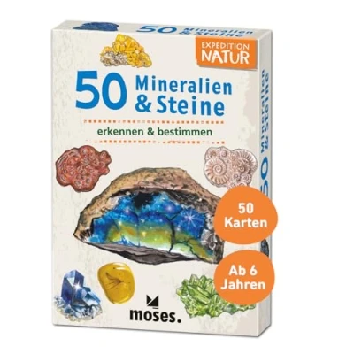 Discover nature. The Expedition Nature series stands for facts, playful quiz questions and lifelike illustrations - so nature becomes an experience! 50 minerals and stones. Whether gold, silver, crystals, gemstones or even fossils - on 50 determination cards you will find the most important rocks and minerals with detailed descriptions Get to know nature with lots of interesting facts, tricky quiz questions and true-to-life illustrations, the little hobby geologists quickly learn everything about their favourite stones For small and large nature lovers. The learning cards are aimed at children aged 6 and up, but also contain interesting information about the different rocks and minerals for adults Perfect for on the go. The playing cards are safely stored in the elegant box and ready for the next hiking and discovery tour, because true treasures can also be found in the local area, Manufacturer: moses. Verlag GmbH