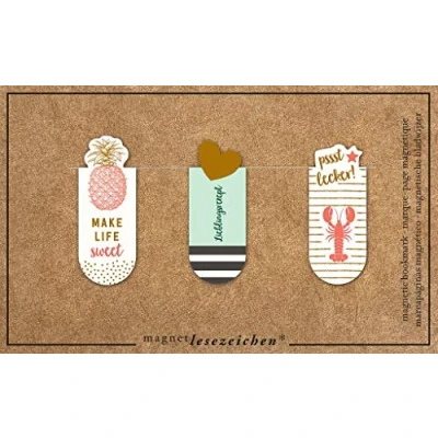 3 colourful magnetic bookmarks in set: the charmingly illustrated bookmarks mark the current reading progress in a stylish way. In addition, the bookmarks with gold foil finish look out of the cookbook, magazine or notebook and are an absolute piece of jewellery. The bookmarks are also perfect for marking documents in the home office or school. To mark simply clip a few pages between the front and back of the bookmark. The magnetic bookmark holds the pages together. According to the motto: Make life sweet. Bookmark measures 5.5cm x 2.1cm