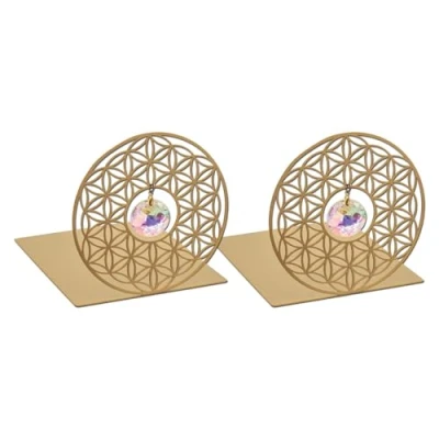 Magical light catch: The sparkling sun crystal conjures up fascinating light effects in any room Elegant metal design. Modern book stand set of 2 made of gold-coloured metal with flower of life motif Decorative and sturdy. The decorative metal stands ensure a secure hold of favourite books on the bookshelf High-quality gift set. Two metal bookends - lovingly packaged in a gift box - perfect as a gift or decorative object Ideal gift idea: For anyone who enjoys careful details, fine decoration and stylish accents