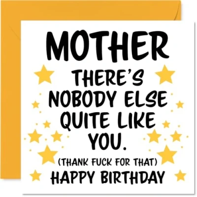 MAKE YOUR MOTHER SMILE WITH THIS UNIQUE BIRTHDAY CARD: This exceptional quality Mother birthday card shows the design 'Mother Theres nobody else quite like you. (Thank fuck for that) Happy Birthday'. If you are looking for an awesome birthday card for Mother, then then this happy birthday Mother card is bound to make them smile. Not just a birthday card for Mother this could also be a birthday gifts for Mother, Mum or Mummy. WHAT DO YOU GET: The card is printed on one side and BLANK ON THE INSIDE to allow you to write your very own message. The unique fun design is printed on a specially sourced and environmentally responsible board. At 360 microns thick the natural white one-sided gloss board has a quality look and feel. Supplied with a coloured gummed envelope to complement the design and ready to be sealed and sent in the post. Great Mother birthday cards, Mum birthday card. NO INK SMUDGES: There is nothing worse than writing inside a card to find that the shiny surface makes the ink smudge. This is why we use a high quality one sided coated board. The uncoated side will absorb more of the ink from your pen to make smudging a thing of the past. Mother birthday cards, Mother birthday cards from Son. SIZES: Greeting Card = 145mm x 145mm, Envelope = 155mm x 155mm, Card Thickness = 360 micron. Happy birthday Mother, Mothers birthday card, Mother cards birthday, birthday card Mother, happy birthday Mother card, Mother gifts from Son. MADE AND QUALITY CHECKED IN THE UK: We print and manufacture all our products right here in the UK so you can be sure of a fast turnaround and a product that is expertly made. Using environmentally responsible premium board our card is conscious of the responsible management of the world's forests - happy birthday card Mother, Mother birthday cards.