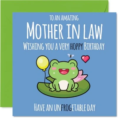 MAKE YOUR MOTHER IN LAW SMILE WITH THIS UNIQUE BIRTHDAY CARD: This exceptional quality Mother in Law birthday card shows the design 'To an amazing Mother in Law Wishing you a very hoppy birthday. Have an unfrogetable day'. If you are looking for a beautiful birthday card Mother in Law, then then this happy birthday Mother in Law card is bound to make them smile. Not just a birthday card for Mother in Law this could also be a birthday gifts for Mother in Law, Mum or Mom. WHAT DO YOU GET: The card is printed on one side and BLANK ON THE INSIDE to allow you to write your very own message. The unique fun design is printed on a specially sourced and environmentally responsible board. At 360 microns thick the natural white one-sided gloss board has a quality look and feel. Supplied with a coloured gummed envelope to complement the design and ready to be sealed and sent in the post. Mother in Law Mothers Day cards, Mum birthday cards, Mom birthday card. NO INK SMUDGES: There is nothing worse than writing inside a card to find that the shiny surface makes the ink smudge. This is why we use a high quality one sided coated board. The uncoated side will absorb more of the ink from your pen to make smudging a thing of the past. Mother in Law birthday cards, Mother in Law birthday cards from Son. SIZES: Greeting Card = 145mm x 145mm, Envelope = 155mm x 155mm, Card Thickness = 360 micron. Happy birthday Mother in Law, Mother in Laws birthday card, Mother in Law cards birthday, birthday card Mother in Law, happy birthday Mother in Law card, Mother in Law gifts from Son. MADE AND QUALITY CHECKED IN THE UK: We print and manufacture all our products right here in the UK so you can be sure of a fast turnaround and a product that is expertly made. Using environmentally responsible premium board our card is conscious of the responsible management of the world's forests - happy birthday card Mother in Law, Mother in Law birthday cards.
