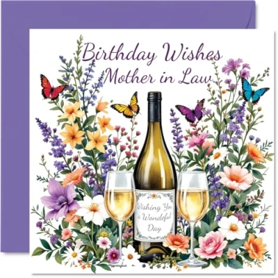 Mother in Law Birthday Card Flowers & Wine Happy for from Son Daughter, 145mm Bday Greeting Cards