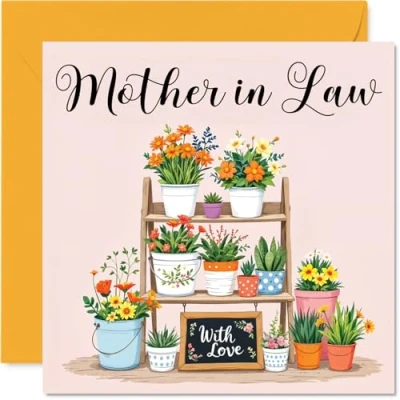 MAKE YOUR MOTHER IN LAW SMILE WITH THIS UNIQUE BIRTHDAY CARD: This exceptional quality Mother in Law birthday card for her shows the design 'Mother in Law With Love'. If you are looking for a beautiful birthday card Mother in Law for her, then then this happy birthday Mother in Law card is bound to make her smile. Not just a birthday card for Mother in Law this could also be a birthday gifts for Mother in Law, Mum or Mom. WHAT DO YOU GET: The card is printed on one side and BLANK ON THE INSIDE to allow you to write your very own message. The unique fun design is printed on a specially sourced and environmentally responsible board. At 360 microns thick the natural white one-sided gloss board has a quality look and feel. Supplied with a coloured gummed envelope to complement the design and ready to be sealed and sent in the post. Great Mother in Law birthday cards, Mum birthday card. NO INK SMUDGES: There is nothing worse than writing inside a card to find that the shiny surface makes the ink smudge. This is why we use a high quality one sided coated board. The uncoated side will absorb more of the ink from your pen to make smudging a thing of the past. Mother in Law birthday cards, Mother in Law birthday cards from Son. SIZES: Greeting Card = 145mm x 145mm, Envelope = 155mm x 155mm, Card Thickness = 360 micron. Happy birthday Mother in Law, Mother in Laws birthday card, Mother in Law cards birthday, birthday card Mother in Law, happy birthday Mother in Law card, Mother in Law gifts from Son. MADE AND QUALITY CHECKED IN THE UK: We print and manufacture all our products right here in the UK so you can be sure of a fast turnaround and a product that is expertly made. Using environmentally responsible premium board our card is conscious of the responsible management of the world's forests - happy birthday card Mother in Law, Mother in Law birthday cards.