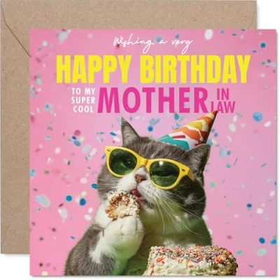 MAKE YOUR MOTHER IN LAW SMILE WITH THIS UNIQUE BIRTHDAY CARD: This exceptional quality Mother in Law birthday card for her shows the design 'Wishing a very Happy Birthday to my super cool Mother in Law'. If you are looking for a beautiful birthday card Mother in Law for her, then then this happy birthday Mother in Law card is bound to make her smile. Not just a birthday card for Mother in Law this could also be a birthday gifts for Mother in Law, Mum or Mom. WHAT DO YOU GET: The cards are printed on both sides with the inside print saying 'Have an Amazing Day' and ample space for your own personal message. The unique fun design is printed on a specially sourced and environmentally responsible board. At 360 microns thick the natural white one-sided gloss board has a quality look and feel. Supplied with a coloured gummed envelope to complement the design and ready to be sealed and sent in the post. NO INK SMUDGES: There is nothing worse than writing inside a card to find that the shiny surface makes the ink smudge. This is why we use a high quality one sided coated board. The uncoated side will absorb more of the ink from your pen to make smudging a thing of the past. Mother in Law birthday cards, Mother in Law birthday cards from Son. SIZES: Greeting Card = 145mm x 145mm, Envelope = 155mm x 155mm, Card Thickness = 360 micron. Happy birthday Mother in Law, Mother in Laws birthday card, Mother in Law cards birthday, birthday card Mother in Law, happy birthday Mother in Law card, Mother in Law gifts from Son. MADE AND QUALITY CHECKED IN THE UK: We print and manufacture all our products right here in the UK so you can be sure of a fast turnaround and a product that is expertly made. Using environmentally responsible premium board our card is conscious of the responsible management of the world's forests - happy birthday card Mother in Law, Mother in Law birthday cards.