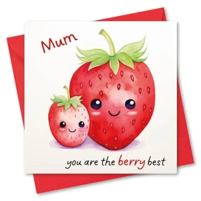 Mother's Day Card. Card for Mum. Cute Strawberries Design. Mothers with Matching Envelope. Size 150x150mm When Folded.