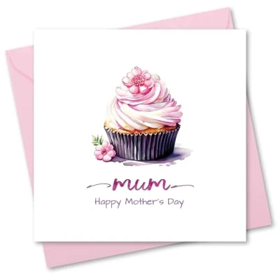 Mother's Day Card for Mum. Cup Cake Design. Mothers with pink foil and matching envelope. Size 150x150mm when folded.