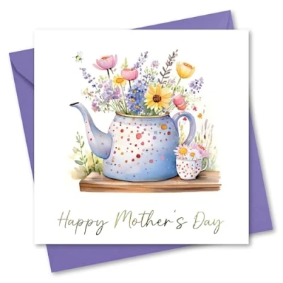 Mother's Day Card for Mum. Teapot with Flowers Design. Mothers gold foil and matching purple envelope. Size 150x150mm when folded.