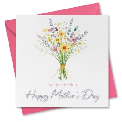Mother's Day card for Mum. Wild Flower Bunch Design. Mothers on textured with matching Envelope. Size 150x150mm when folded.