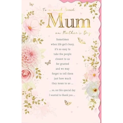 A High Quality Greeting Card and Envelope From Regal Publishing Designed and made in the UK - supporting British jobs Caption: Mum Description: Pink floral Approximate size: 12 x 8 inches