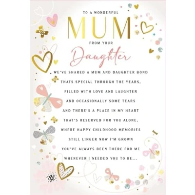 A High Quality Greeting Card and Envelope From Regal Publishing Designed and made in the UK - supporting British jobs Caption: Mum From Daughter Description: Butterflies Approximate size: 9 x 6 inches