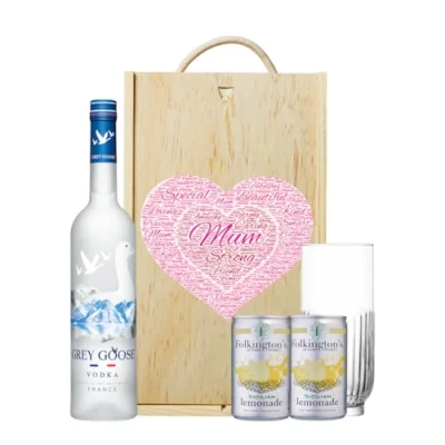 Mother's Day Grey Goose Vodka Set with Fever Tree Lemonade & Glass in Double Wooden Box (70cl) Mothers Day, Hamper, Mum, Hampers Gourmet Gifts, Birthday