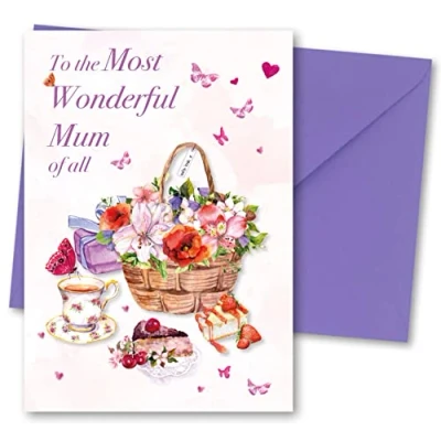 MOTHERS DAY CARDS FOR MUM - 210 x 148mm when folded. Card supplied folded and individually wrapped with purple envelope. MADE IN THE UK – Designed, printed and packed in the UK, our cards are made from board which is manufactured in Europe. Cards have verse inside. POSTAGE - Each card and envelope weight 32g. 162x229x3mm (UK Postage: Letter) PREMIUM QUALITY THICK CARD – 365 Microns sturdy card with luxury feel. Supplied with premium quality envelope. COMPOSTABLE BAG - Supplied in protective Biodegradable and Compostable clear bag. Made with minimum 80% renewable bio-based content.
