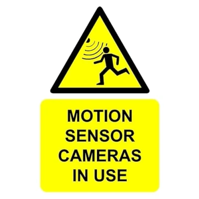 Motion sensor cameras in use safety sign. 1mm flexible Plastic sign. Digitally printed for extra durability. Drill and screw in position or use double sided tape to mount onto suitable surface. All signs come with a 5-year warranty. All our signs are UV resistant meaning they will not fade in sunlight. Suitable for indoor & outdoor use.
