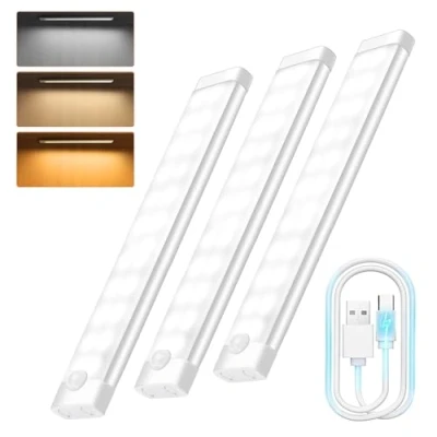 Motion Sensor Lights 20cm Under Cabinet Kitchen Lights, 3 Color Rechargeable Night Light, Auto On/Off Dimming Wardrobe for Stairs, Cabinet, Closet, Room, Wardrobe, Pack